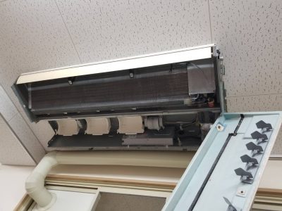 京都府某施設にてエアコン分解洗浄の依頼があり作業をしてきました。