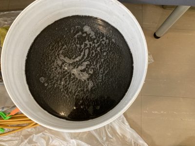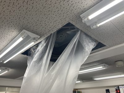 天井設置型のエアコンで全て分解し、噴霧器と高圧で洗浄を行い汚水をバケツに落ちる様に周りを綺麗に養生し作業を行いました。